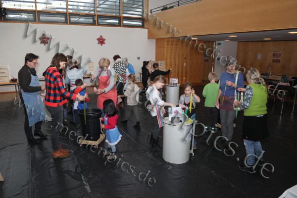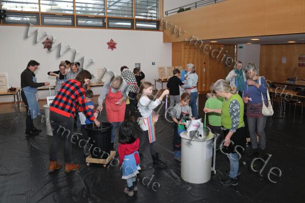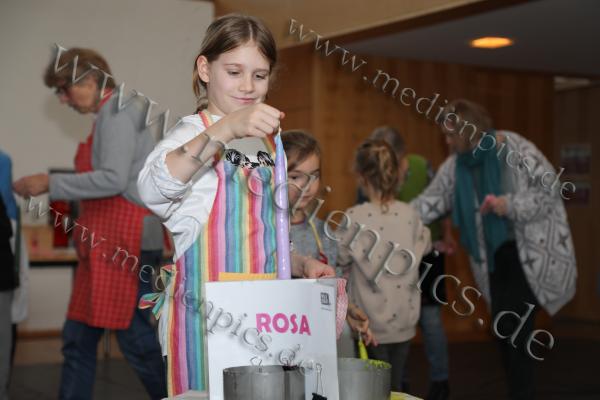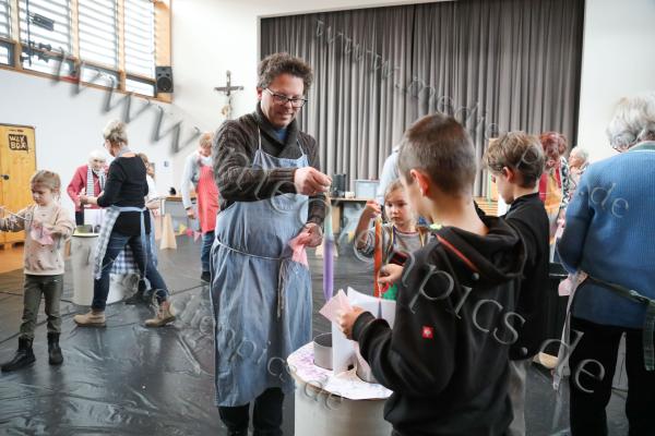 Großen Zuspruch erlebte die Pfarrei St. Peter & Paul in Oberammergau beim Kerzenziehen. Der Pfarrsaal füllte sich mit ganzen Familien, teils über vier Generationen hinweg, die gemeinsam ihrer Kreativität freien Lauf ließen. Ob jung oder alt, jeder konnte seine eigene Kerze gestalten und dabei Geduld sowie Fingerspitzengefühl unter Beweis stellen.Zur Auswahl standen insgesamt neun verschiedene Farben, in die der Docht immer wieder in das flüssige Wachs getaucht wurde. Mit jedem weiteren Tauchgang wuchs die Kerze ein Stück und gewann an Dicke. Besonders beliebt war es, mehrere Farben zu kombinieren und so individuelle Muster entstehen zu lassen. Die Freude über das selbst geschaffene Werk war den Teilnehmern deutlich anzusehen. So zeigte sich auch die neunjährige Laura Madersbacher stolz mit ihrer bunten Kerze.