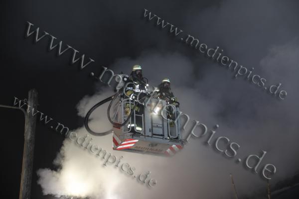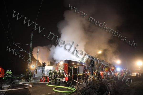 Mit schwerem Atemschutz drangen die Wehrmänner in das Gebäude vor, es war nicht mehr zu retten. Mit unzähligen Schlauchleitungen wurde das Löschwasser an die Einsatzstelle transportiert. Sogar über die parallel verlaufende Bahnstrecke wurden die Leitungen verlegt. Hierzu kam der Notfall-Manager der Deutschen Bahn und sperrte den Streckenabschnitt für den Zugverkehr.