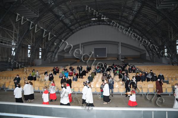 Als der Dekan mit seinen Ministrantinnen und Ministranten zum Gottesdienst in das Theater einzog, durfte die Jüngste Ministrantin, die 10-jährige Amrei Martha das Christuskind tragen und vor dem Altar in die schon wartende Krippe gelegt.